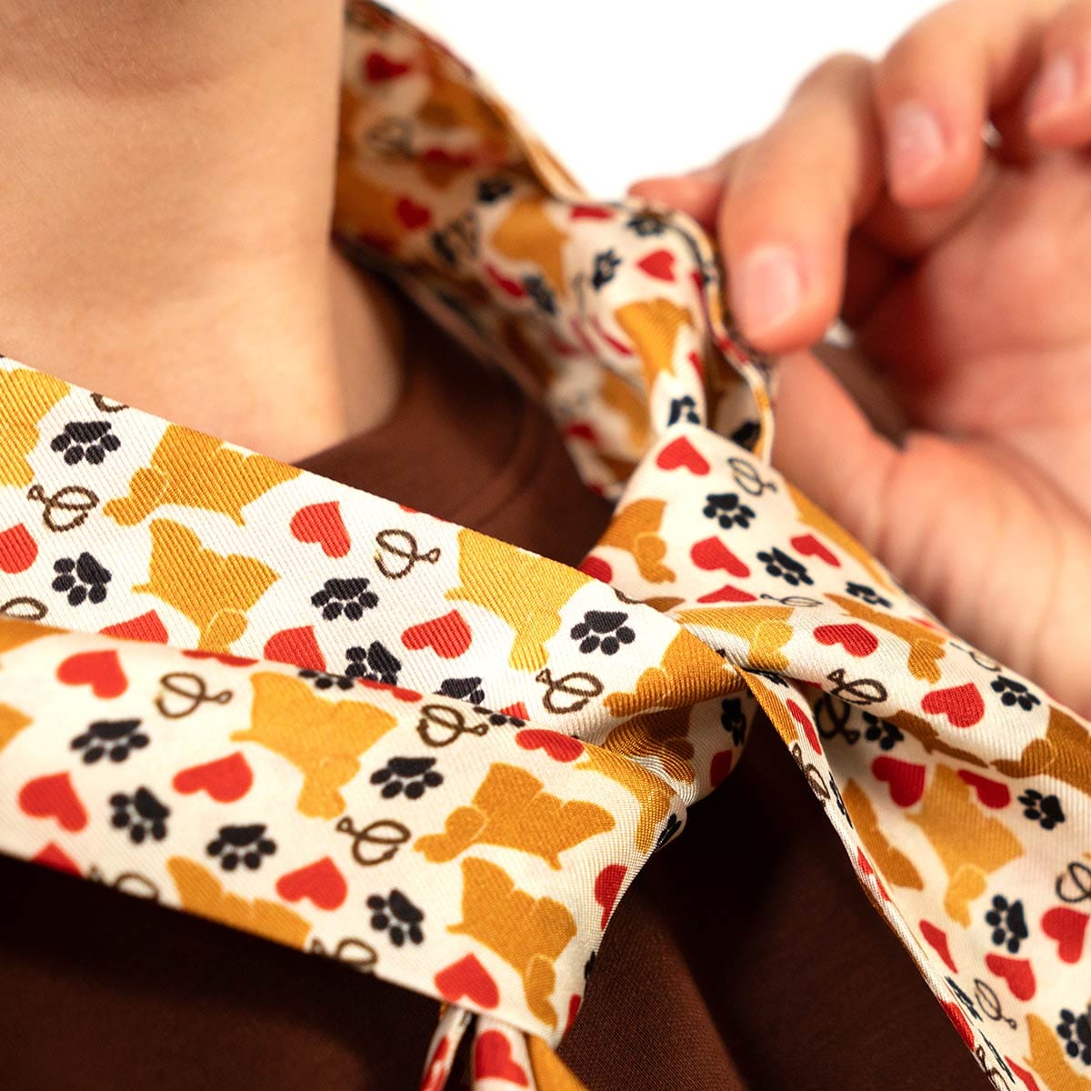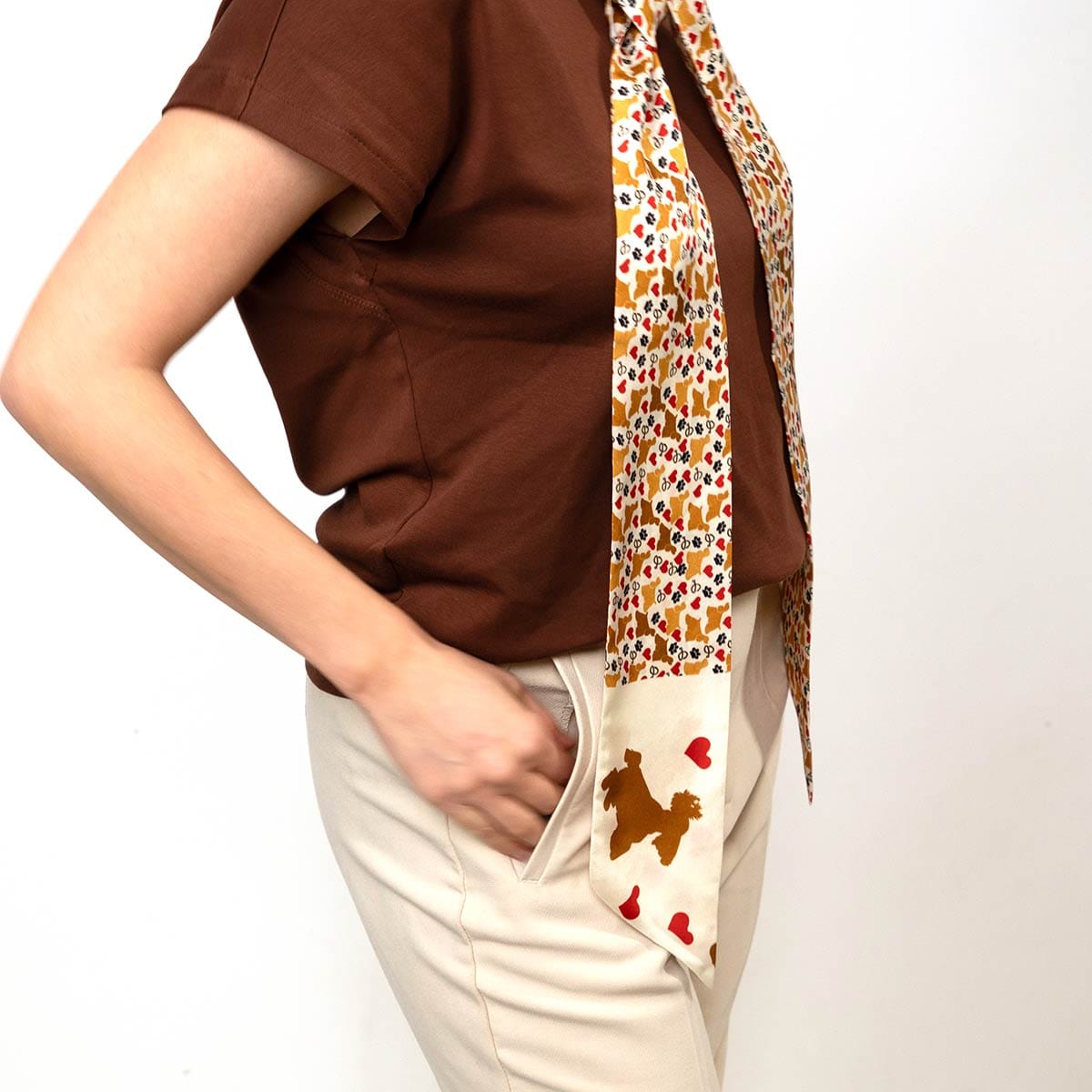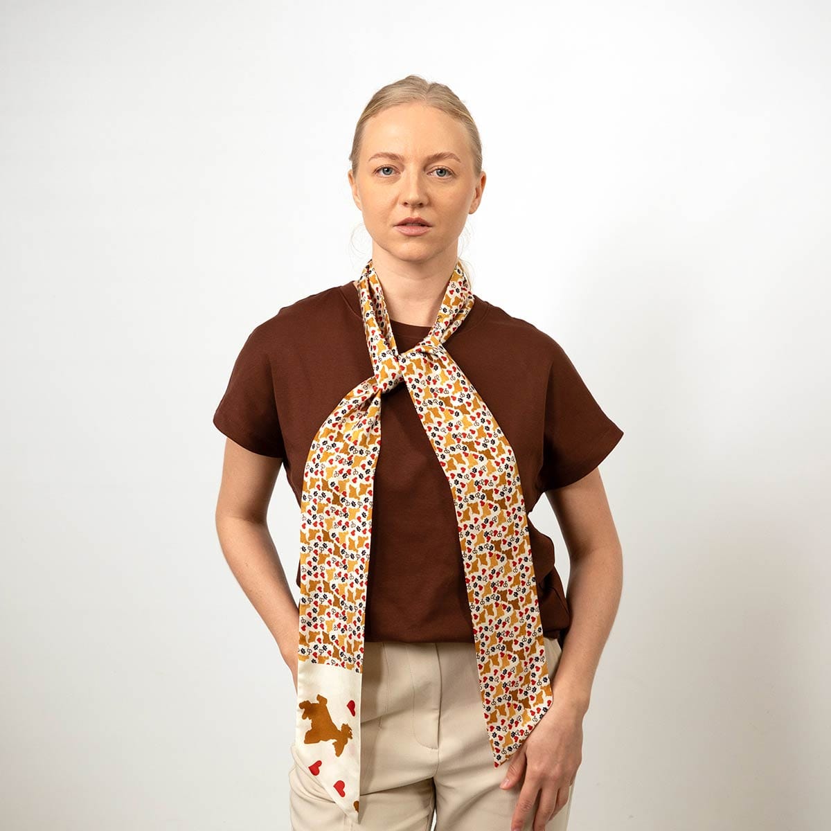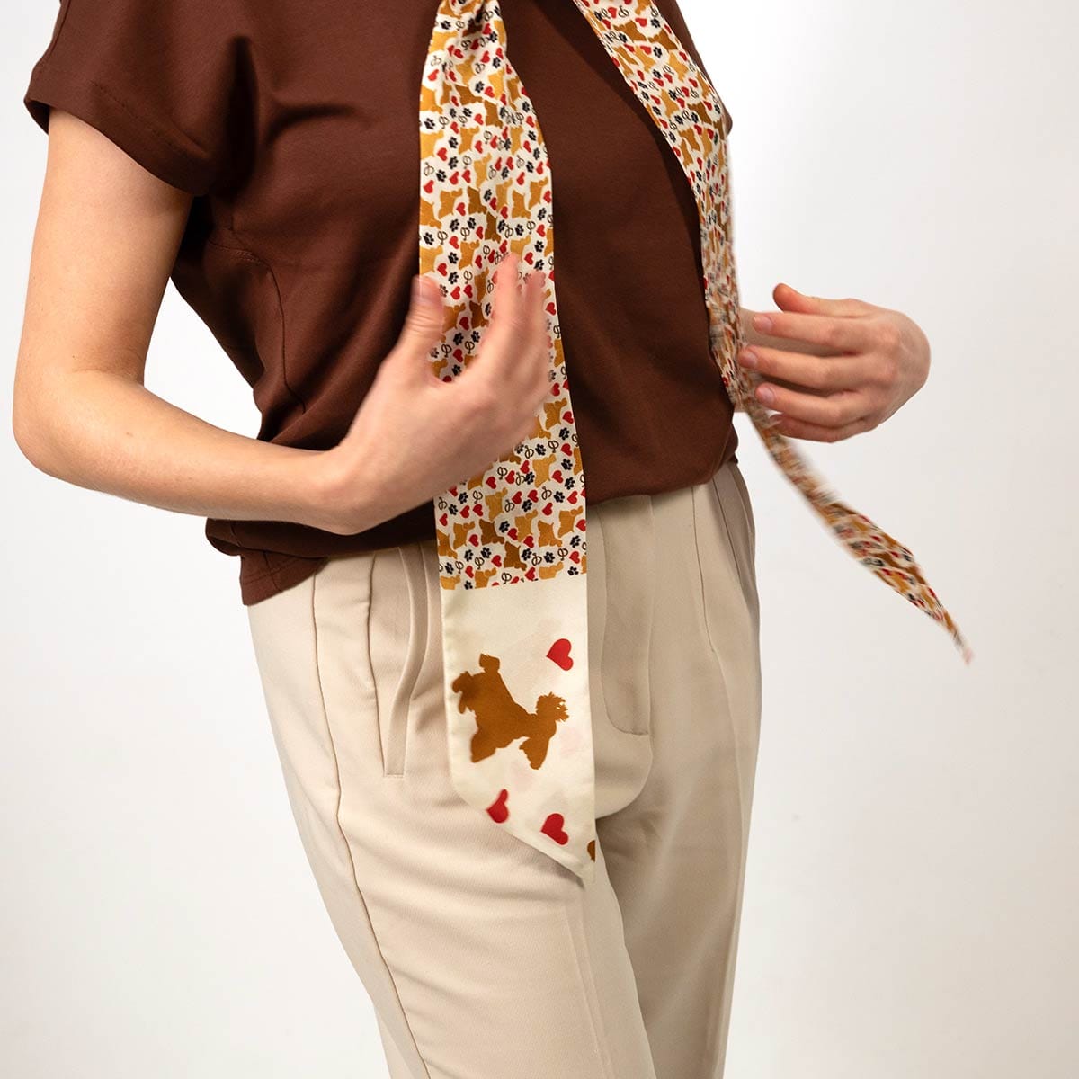 Luxury silk twilly scarf with Camila pet-inspired design, tied on a wrist.