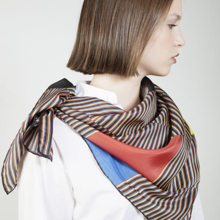The silk square scarf “Farewell” in black is inspired by the work of kinetic artist Carlos Cruz-Diez. The design is structured in vertical panels over a black background, most of them filled with fine horizontal lines in primary colors, giving the piece a sense of movement as the perception of color shifts depending on the point of view. The plain color rectangles represent the palette flowing from the vertical panels, a gesture of the design’s experimentation with color. This scarf is a tribute to the human ability to adapt to diverse contexts.