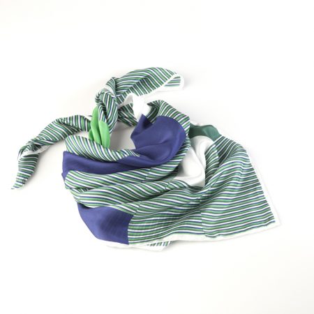The silk square scarf “Farewell” in green is inspired by the work of kinetic artist Carlos Cruz-Diez. The design is structured in vertical panels over a white background, most of them filled with fine horizontal lines in green and blue, giving the piece a sense of movement as the perception of color changes depending on the point of view. The plain color rectangles represent the palette flowing from the vertical panels, a gesture of the design’s experimentation with color. This scarf is a tribute to the light and colors of the sea.