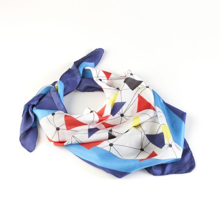 The natural silk scarf “Flying Macaws” in white is inspired by the flight of splendid macaw flocks, whose calls and vivid colors adorn the sunsets of the city. On a white background framed by a blue sky, colored triangles in yellow, blue, red, and black are arranged in diverse positions, representing an abstract vision of these birds in flight. The triangles are connected to one another and to the sky by lines and connectors, symbolizing the relationship between birds, nature, and the city’s inhabitants.