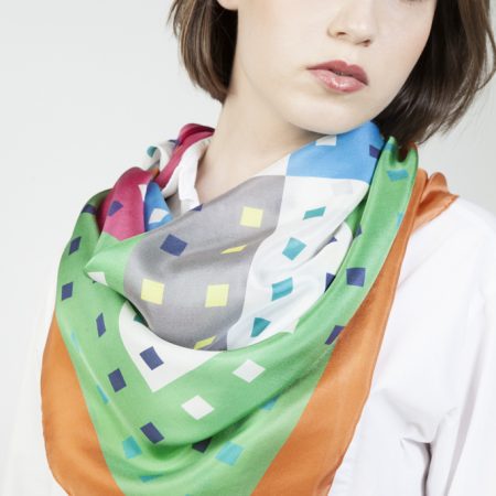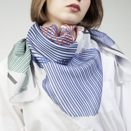 The silk scarf “Sphere in the sky” in white is inspired by the artwork of the kinetic artist Jesús Soto that adorns many cities around the world and in his search for each of his artworks to interact with the viewer. The background in white embraces circles in green, blue, and orange as well as grey lines, representing nature, sky, and the metal of the cities attenuated by the day’s whitish light. The spheres of several diameters are filled with multiple diagonal lines that bring dynamism to the whole design which seems to float and move in the space.