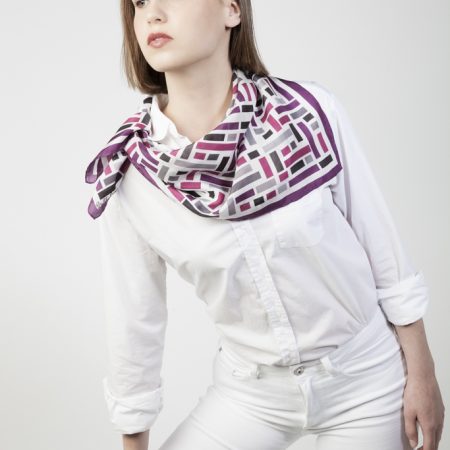 The natural silk accessory “This Lovely City” in purple is inspired by the aerial view of the architectural volumes that define the city’s urban landscape, where modernity and tradition meet to create a unique rhythm. From the white background framed in purple emerge rectangles of varying heights in purple, pink, gray, and black, arranged both vertically and horizontally. The colors are applied randomly to the rectangles, forming a unique alternating pattern that evokes a sense of intimacy and abstraction.