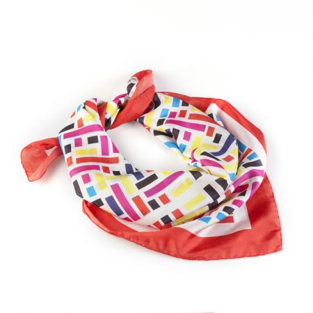 The natural silk accessory “This Lovely City” in red is inspired by the aerial view of the architectural volumes that define the city’s urban landscape, where modernity and tradition meet to create a unique rhythm. From the white background framed in red emerge rectangles of varying heights in fuchsia, yellow, turquoise, blue, red, and black, arranged both vertically and horizontally. The colors are applied randomly to the rectangles, creating a unique alternating pattern with a fast and brilliant rhythm.