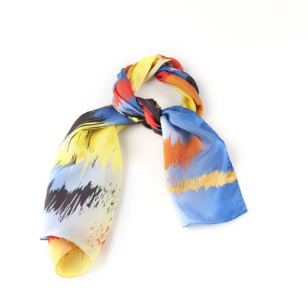 The natural silk scarf “Sunset” in yellow is inspired by the city’s stunning sunsets, where yellow, orange, red, blue, and black lights create a chromatic composition that announces the night and opens new possibilities. The design represents light as spots tearing through the sky as the sun sets on the horizon. The color transitions are emphatic and overlap to represent the passage of the hours. The yellows and oranges slowly give way to the night, while the blue of the day gradually fades.