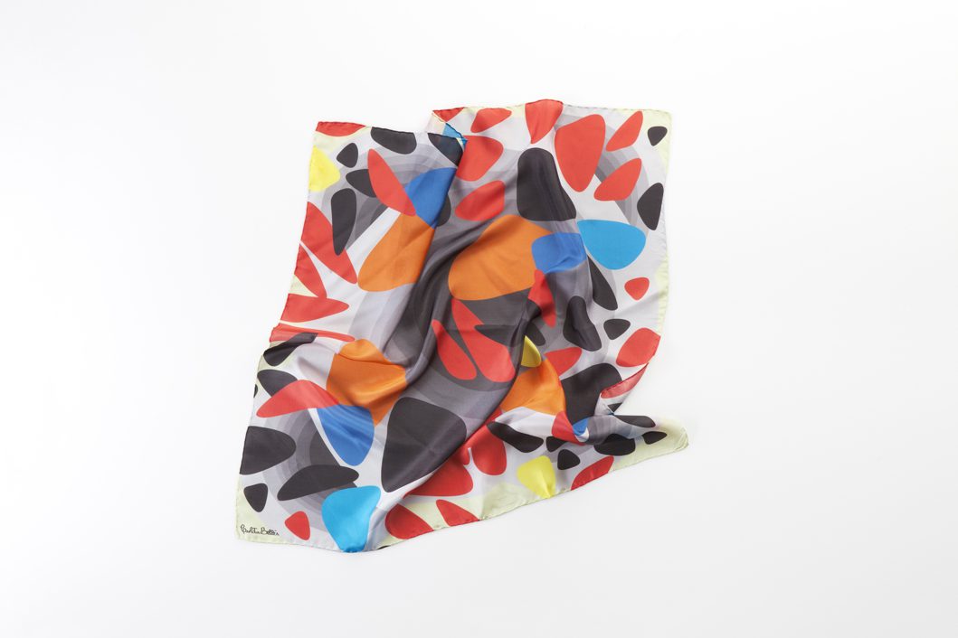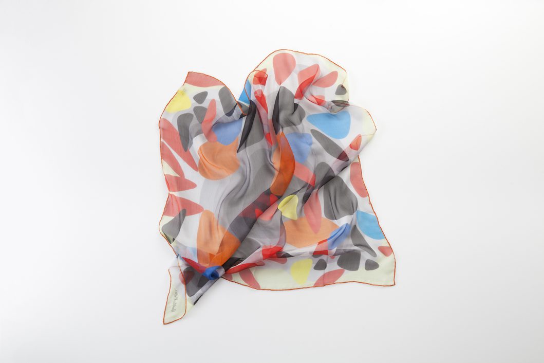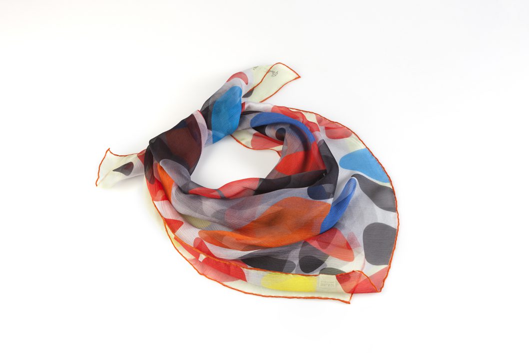 The natural silk square scarf “Magnificent Clouds” in red reinterprets the work of artist Alexander Calder, “Floating Clouds,” in which art, decorative elements, and acoustics combine to create an atmosphere of joy. The design is set on a background of concentric circles in gray tones that fade away, representing acoustic waves. Floating above them are clouds in red, orange, yellow, blue, and black, whose positioning and contrasts give the design a musical rhythm.