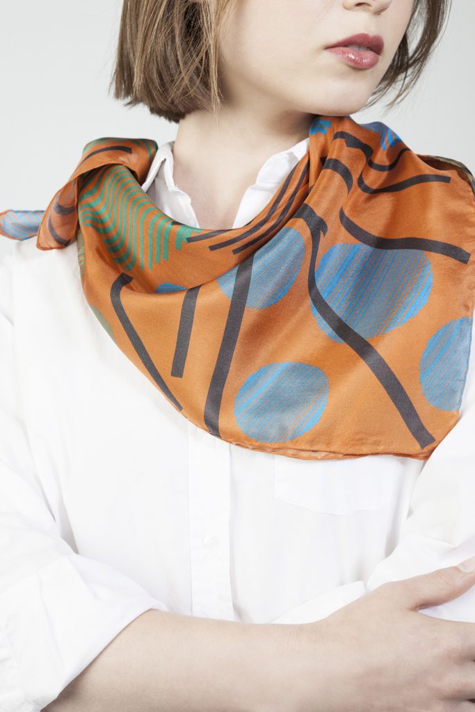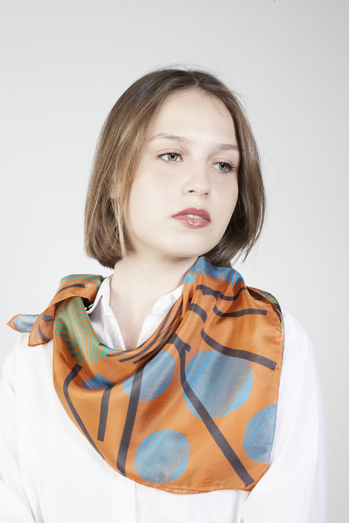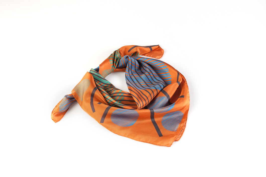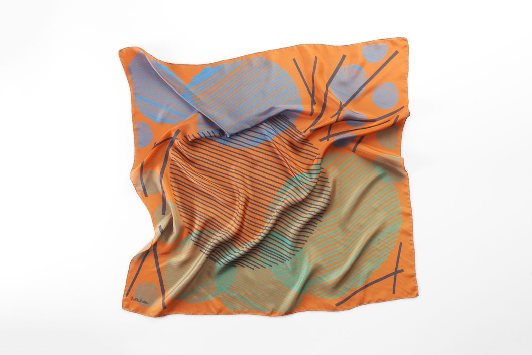 The silk scarf “Sphere in the Sky” in blue is inspired by the artwork of kinetic artist Jesús Soto, whose creations adorn many cities around the world, always seeking interaction with the viewer. The orange background embraces circles in green, blue, and gray, representing nature, the sky, and the metal of the cities. Spheres of various diameters are filled with multiple diagonal lines, adding dynamism to the design, which appears to float and move with the rhythm of the wind.