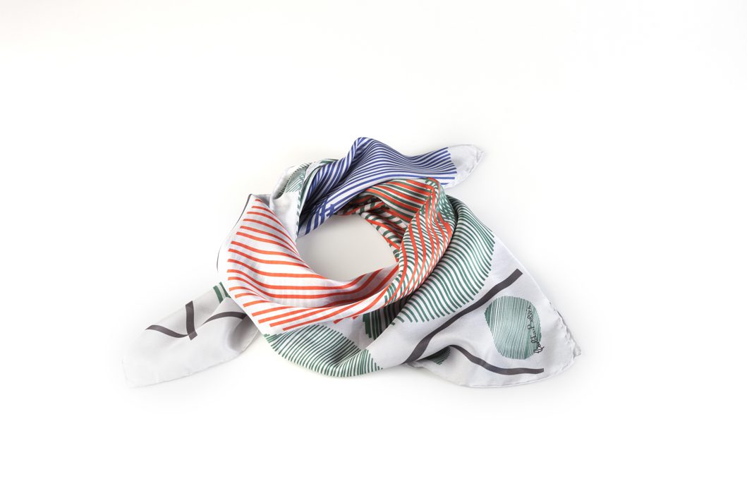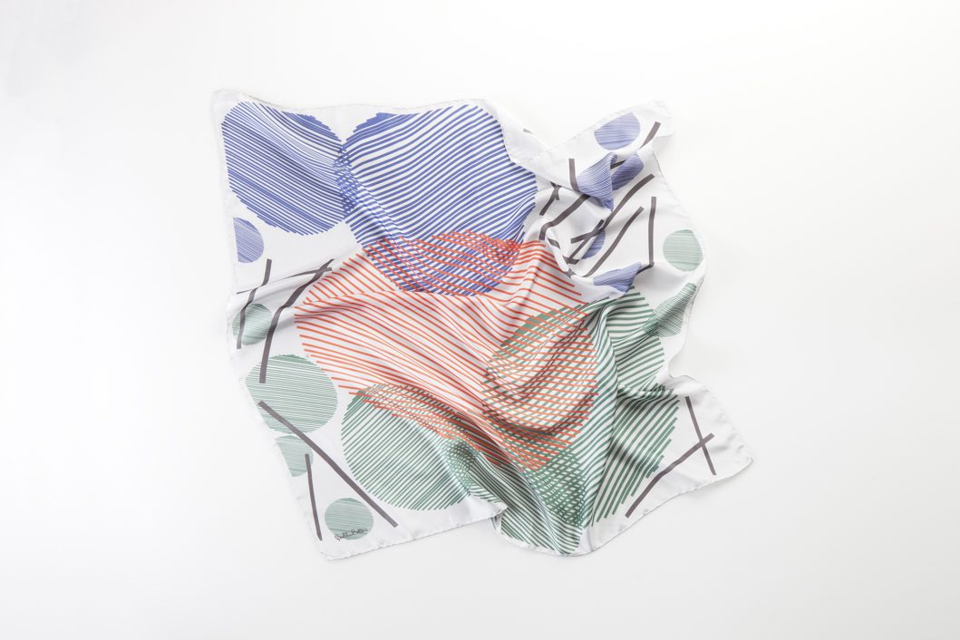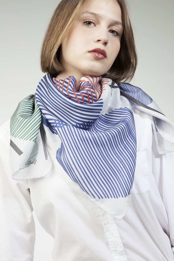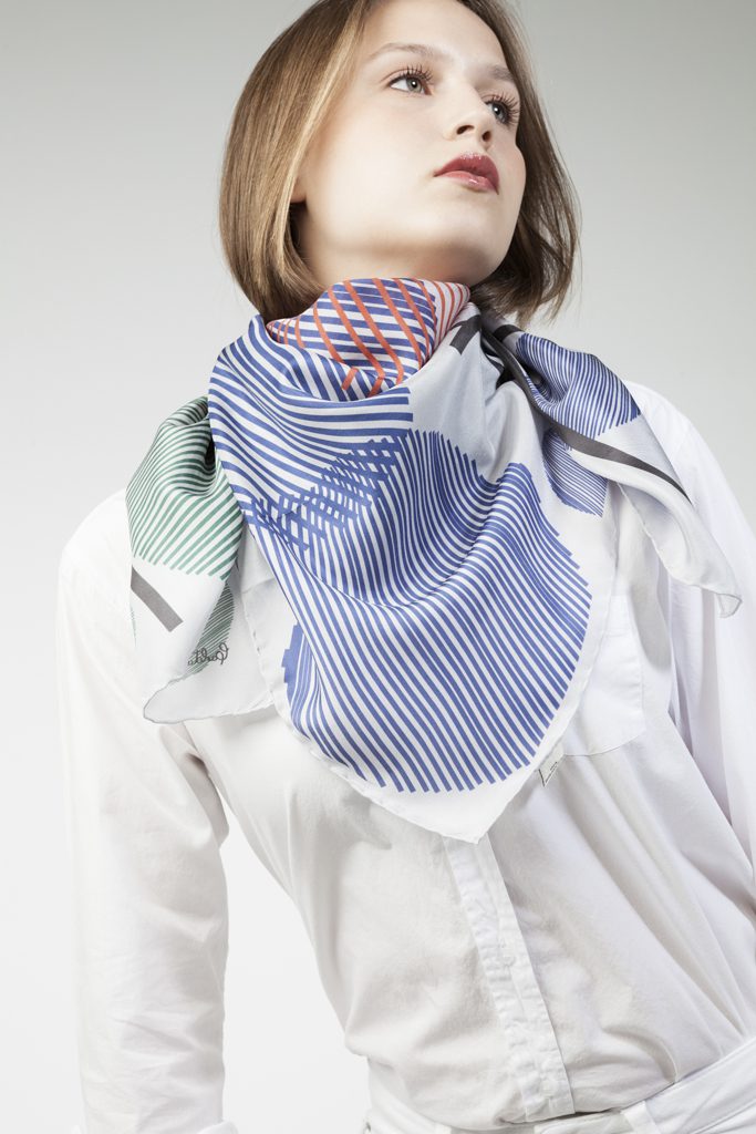 The silk scarf “Sphere in the sky” in white is inspired by the artwork of the kinetic artist Jesús Soto that adorns many cities around the world and in his search for each of his artworks to interact with the viewer. The background in white embraces circles in green, blue, and orange as well as grey lines, representing nature, sky, and the metal of the cities attenuated by the day’s whitish light. The spheres of several diameters are filled with multiple diagonal lines that bring dynamism to the whole design which seems to float and move in the space.