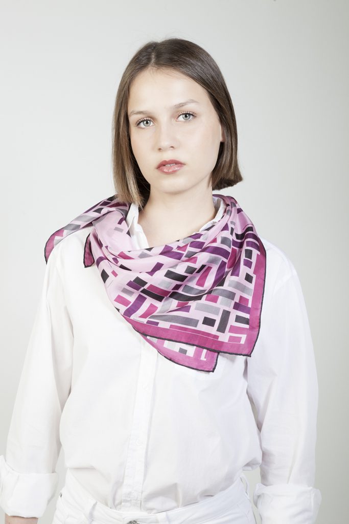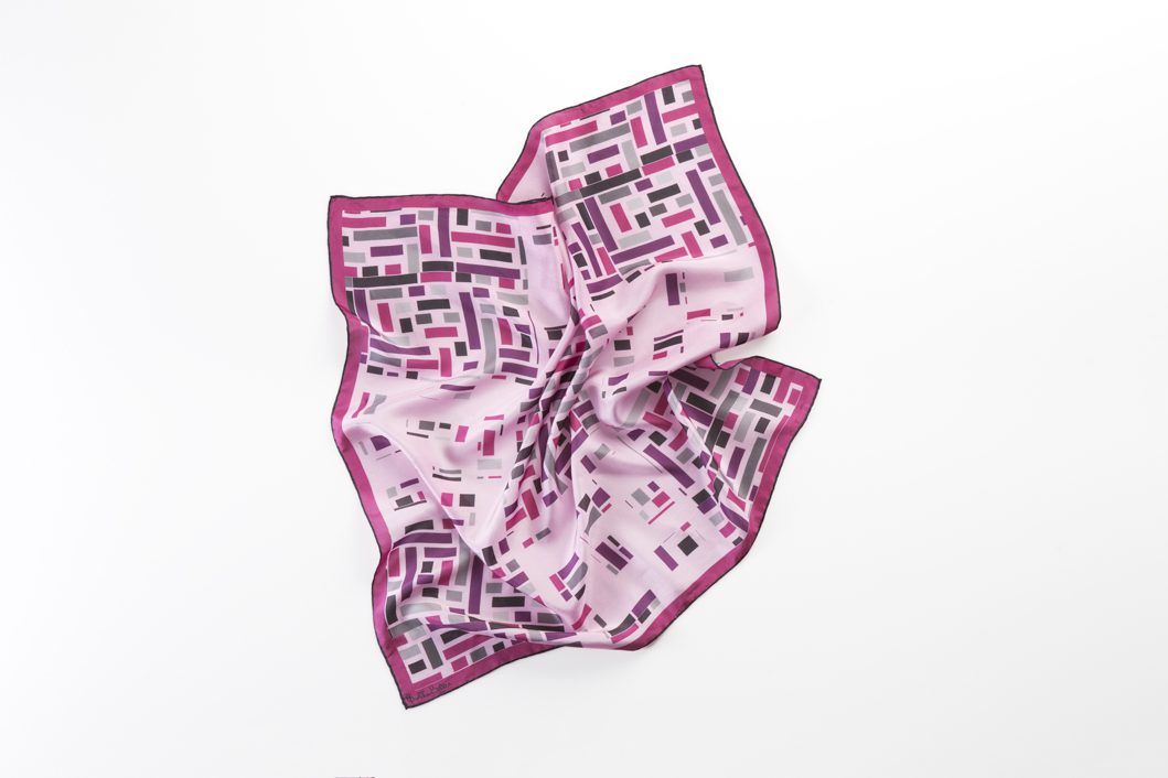 The silk scarf “Wild West” tells the story of many personal journeys which, in their diversity, create a shared destiny in the city. It combines purple and violet tones, representing people’s stories through rectangles of various sizes and colors. The recurring patterns become unique due to their diverse placement within the composition, giving the design a sense of both dynamism and natural order amid the chaos.