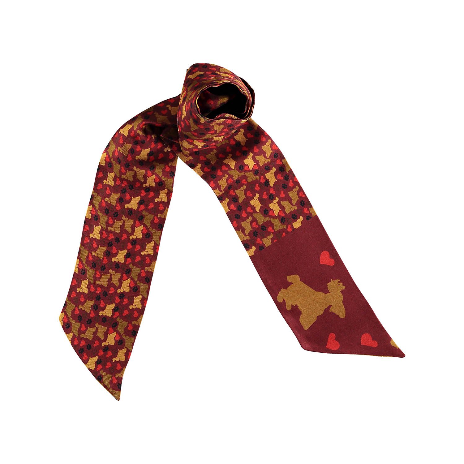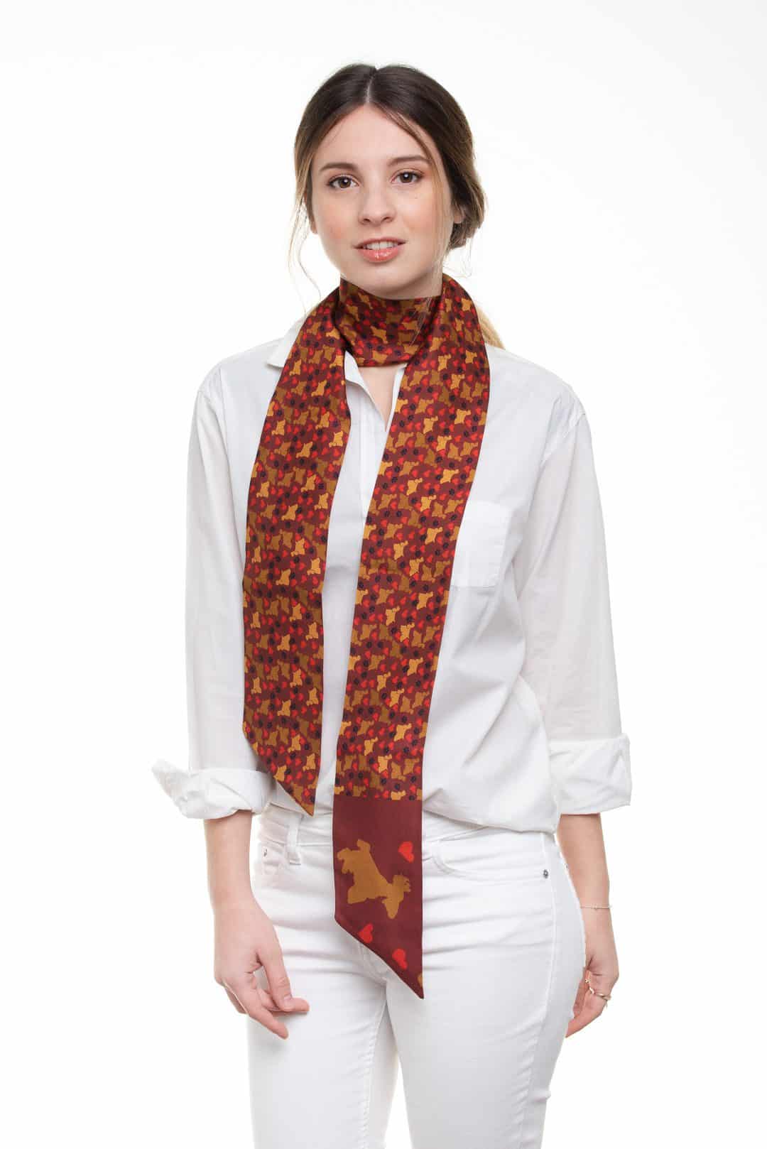 The silk twilly “Camila” pays tribute to an American Cocker who was my beloved and loyal companion for many years. She was adopted at barely a month old when her fate was still quite uncertain.