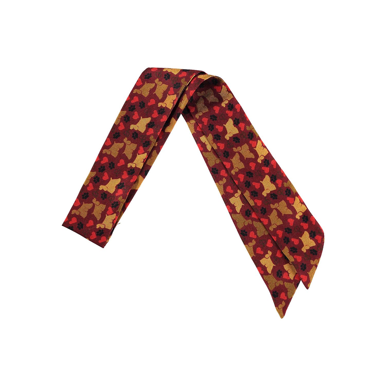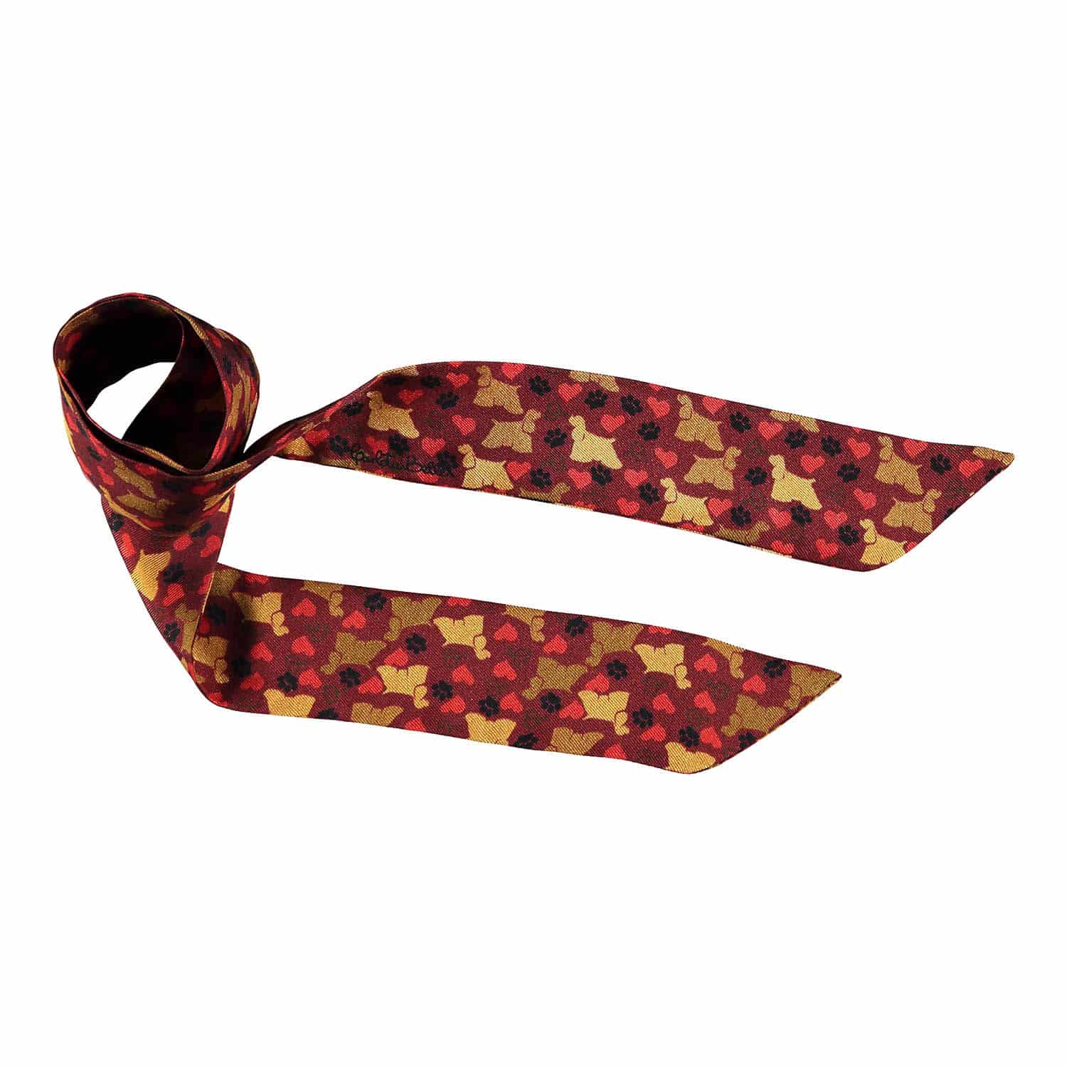 The design of the silk twilly “Camila” features a pattern where an American Cocker, drawn with simple lines in different shades, takes center stage. On a deep green background, footprints, dog leashes, and hearts represent the unconditional love and joyful moments that our pets bring us.
