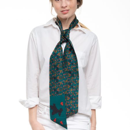 The design of the silk twilly “Camila” features a pattern where an American Cocker, drawn with simple lines in different shades, takes center stage. On a deep green background, footprints, dog leashes, and hearts represent the unconditional love and joyful moments that our pets bring us.