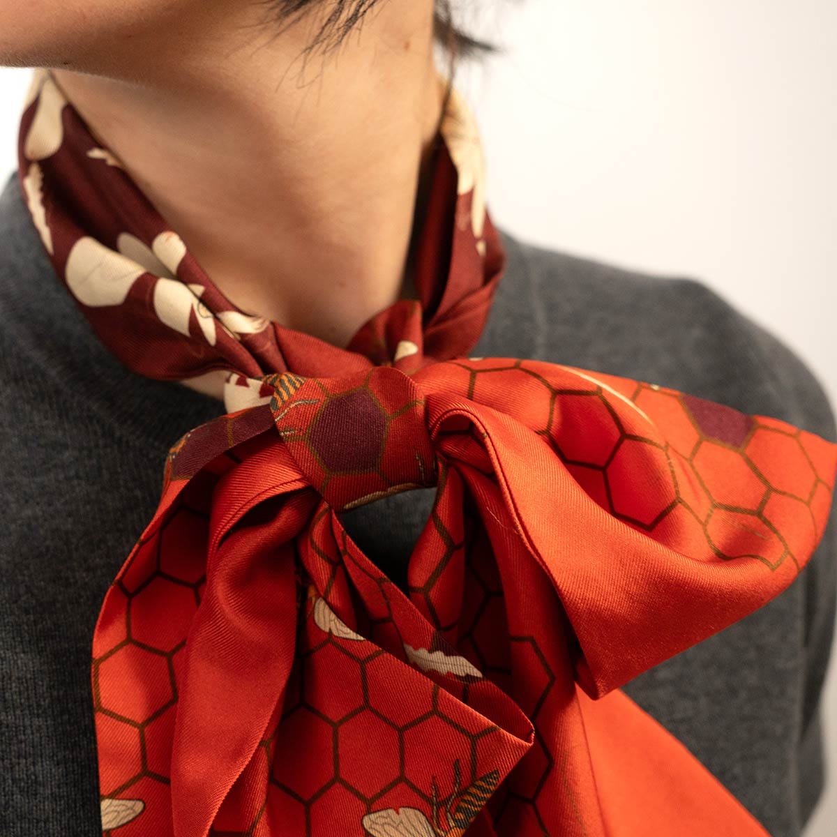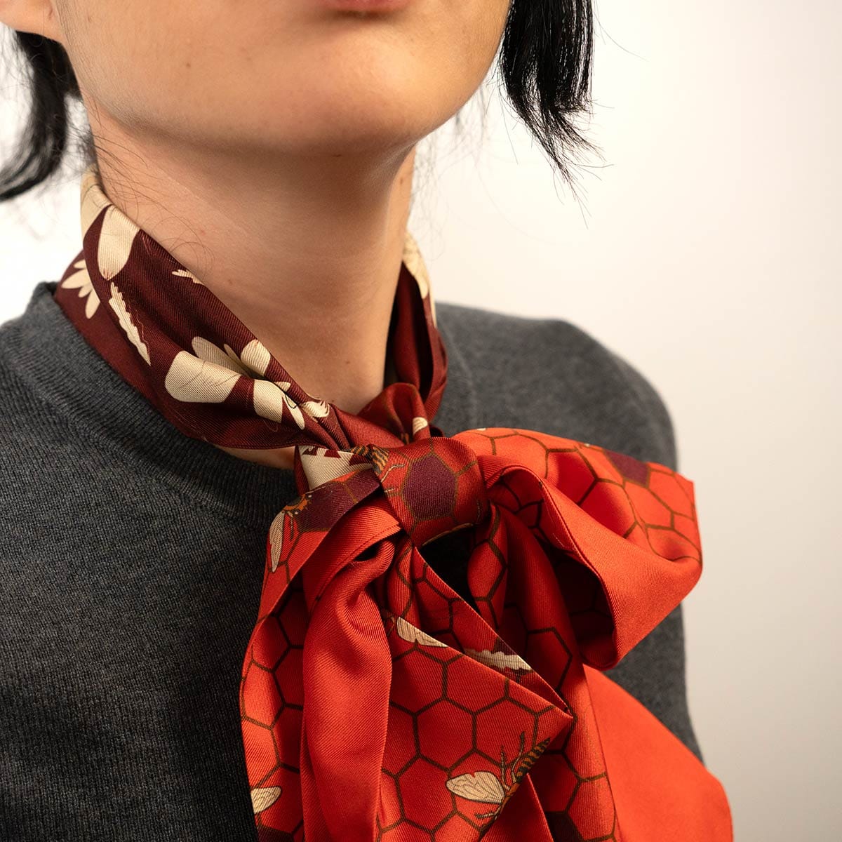 Un diseño refinado que evoca la fuerza silenciosa de la naturaleza: flores delicadas, la geometría del panal y el vuelo decidido de las abejas, todo impreso sobre seda.